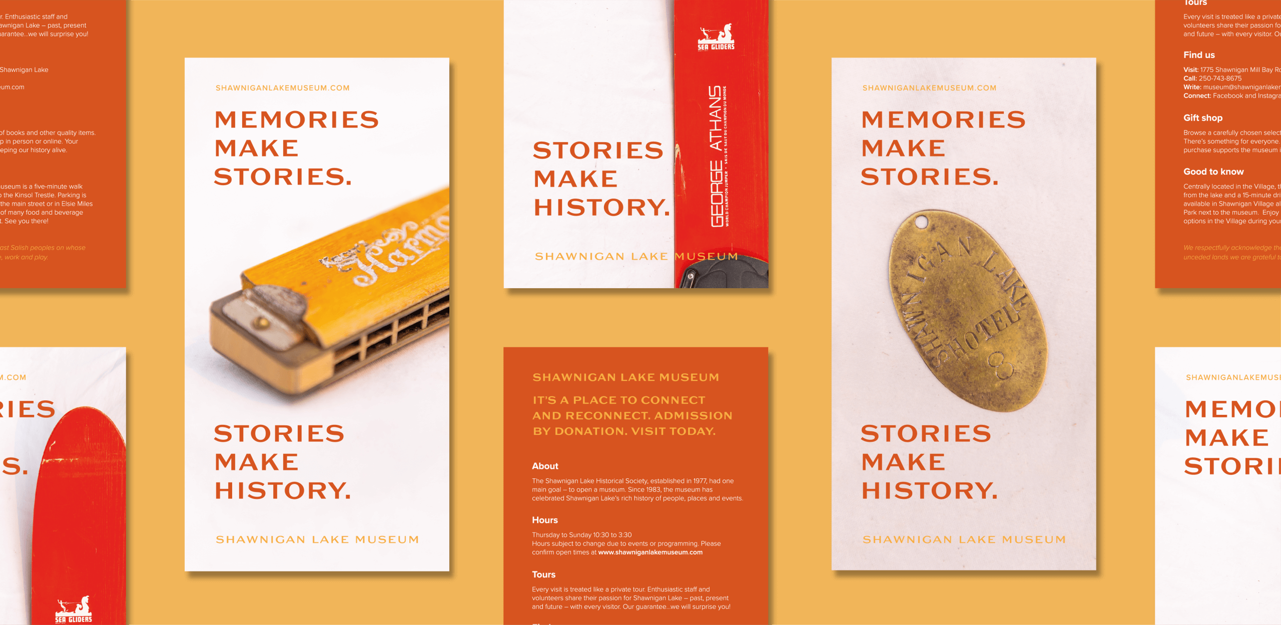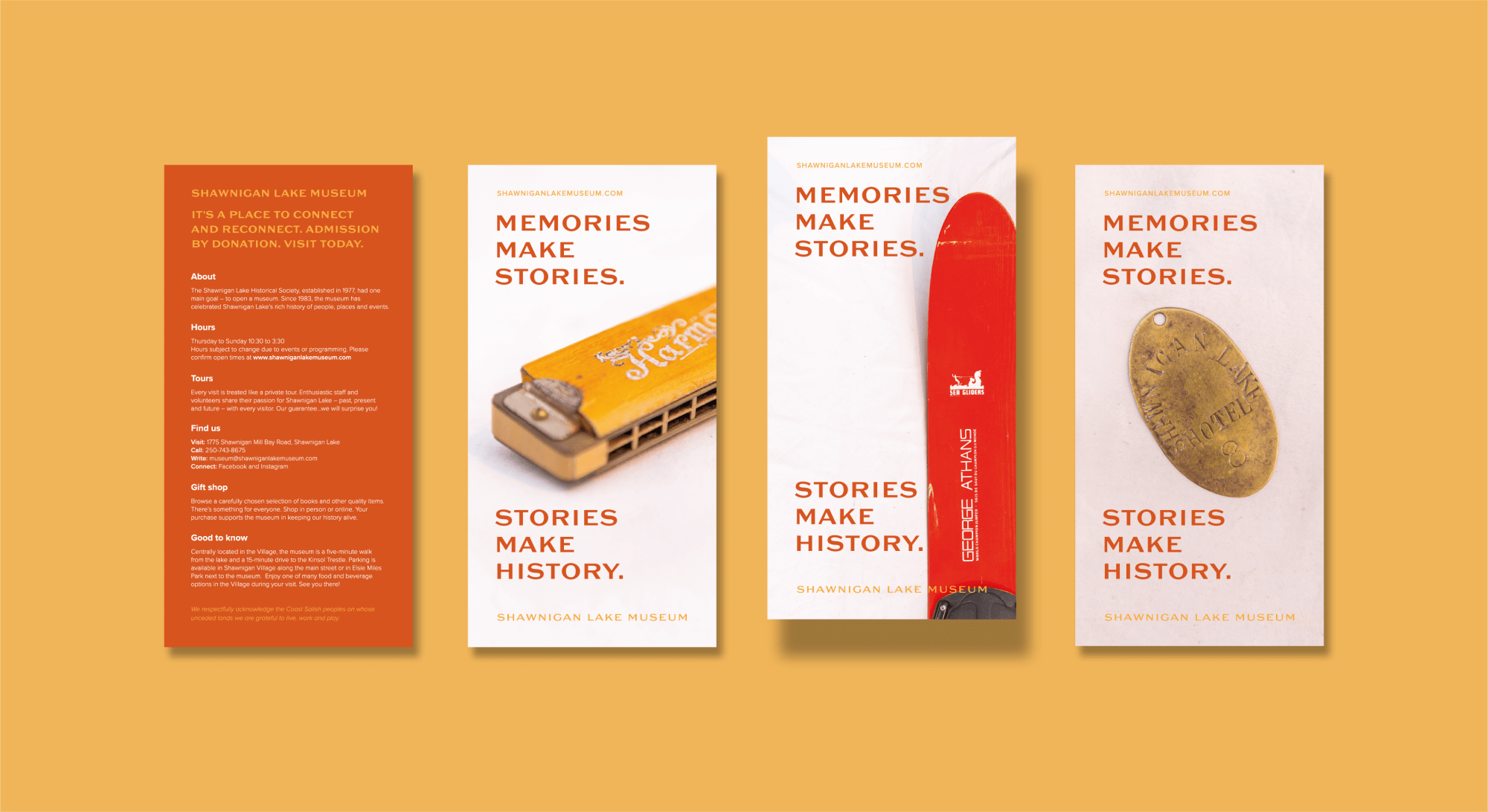 We created a family of postcards that were mailed out to the residents of Shawnigan Lake, each one carrying a distinct message around how to get involved in supporting the museum.